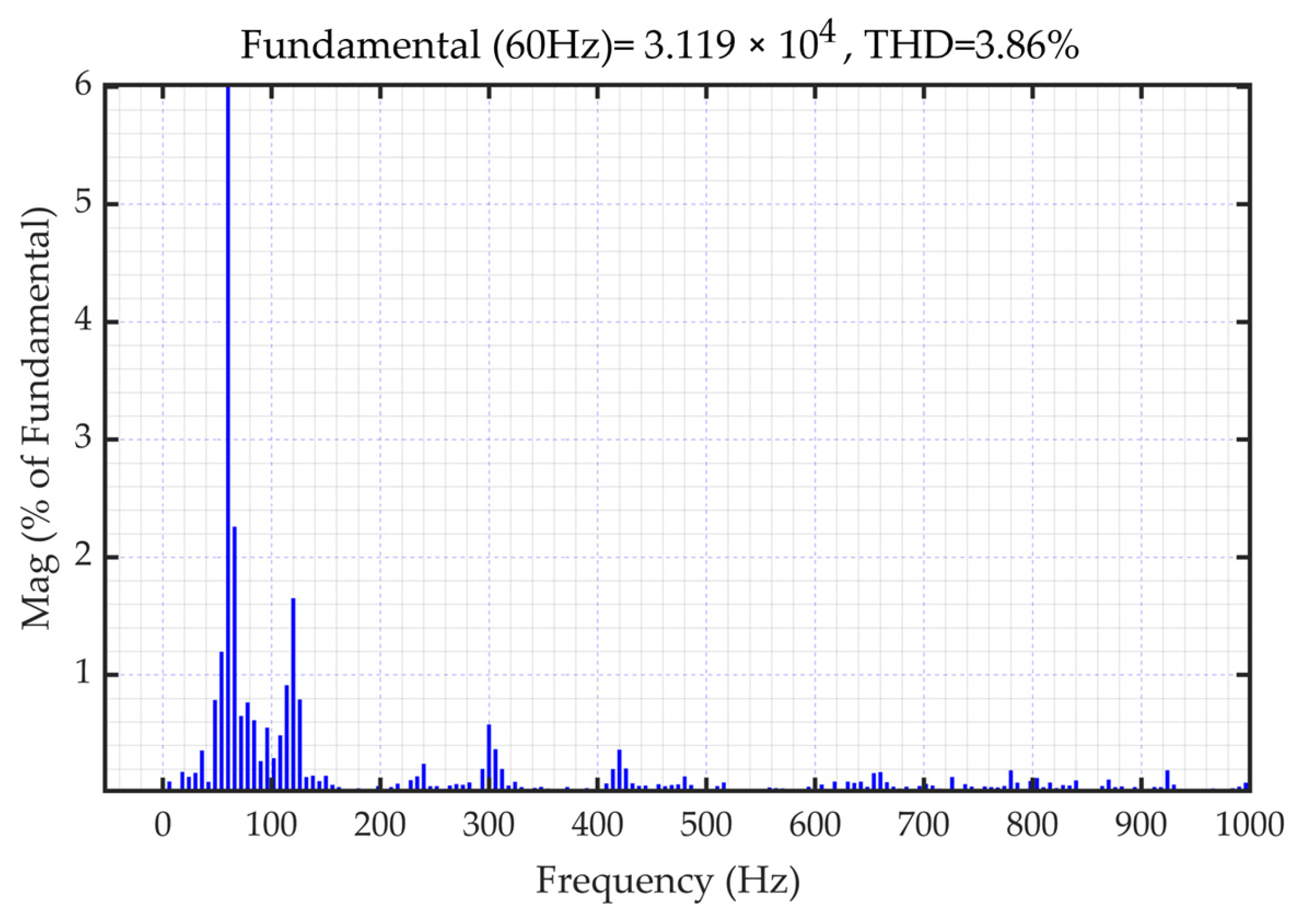Figure 5 shows the Total Harmonic Distortion (THD) of the voltage at the PCC, demonstrating that the proposed SSFCL does not introduce significant harmonic distortion under steady-state conditions. The resulting THD remains within the IEEE 519-2022 standard limits [