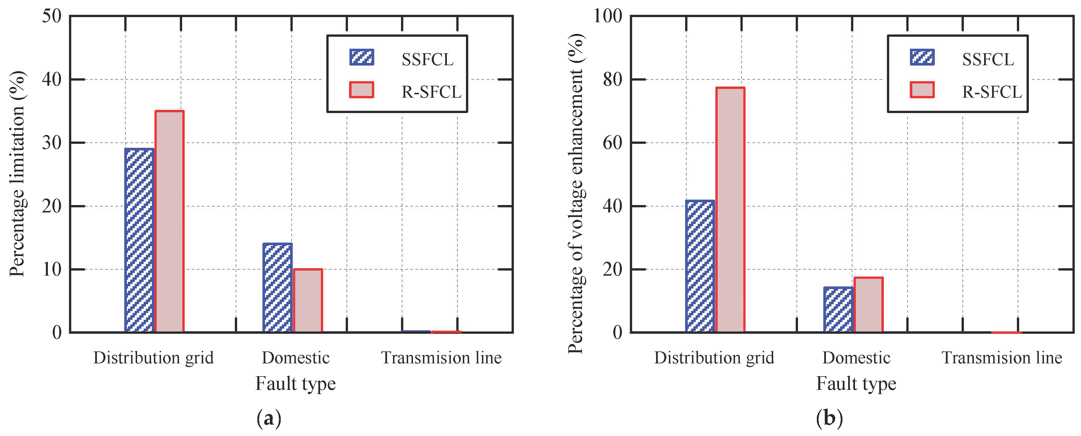 Overall comparison of R-SFCL and proposed SSFCL performance under different fault scenarios: (a) Percentage limitation of fault current and (b) Percentage improved voltage.