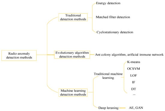 Currently, radio anomaly detection technologies can be broadly categorized, based on the methods used, into traditional detection methods, evolutionary algorithm-based detection methods, and machine learning-based detection methods. The specific methods are summarized in Figure 1.