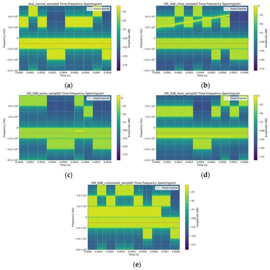 The dataset comprises 10,896 samples, divided into training and test sets. The training set contains 8096 normal signal samples. The test set includes 1000 normal signal samples and 1800 anomalous signal samples. The anomalous signals are superimposed on normal signals at specified ISR values, ranging from −20 dB to 20 dB in 5 dB increments. For each ISR value, there are 50 samples per anomaly type, resulting in 200 anomalous samples per ISR level. When evaluating model performance under different ISR conditions, the corresponding test set is constructed using 1000 normal signals and 200 anomalous signals. Each sample is converted into a time-frequency representation via STFT, ultimately generating a compressed spectrogram of size 64 × 64. We visualized the time-frequency diagrams of normal signals and anomalous signals at 0 dB ISR, with the results shown in Figure 3.