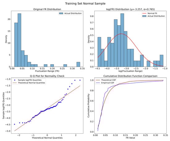 We first extracted the fluctuation amplitude sequences from the normal samples in the training set of the simulated dataset. These sequences were used to plot: the distribution histogram of the sample fluctuation amplitudes, the distribution histogram after logarithmic transformation and the fitted normal distribution curve Additionally, two core visualization tools from statistics were employed to validate the data distribution morphology: Quantile-Quantile (Q-Q) plot and cumulative distribution function (CDF) plot. These tools were applied through quantile matching and cumulative probability curves to verify and visualize the distribution morphology of the fluctuation amplitude sequence data, thereby determining whether the data conforms to a lognormal distribution. The results are shown in Figure 4.