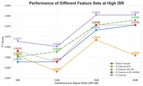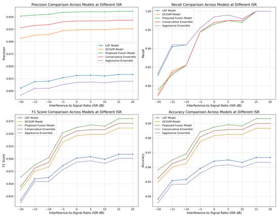 Figure 7 shows that, among the four metrics—precision, recall, F1-score, and accuracy—the proposed fusion model achieved the best performance in all except recall. Analyzing the recall and precision subplots, the LOF model and the aggressively integrated model exhibited high recall both exceeding 0.83, but their precision was significantly lower compared to other models. This reflects the inherent trade-off between recall and precision in anomaly detection tasks: high recall often indicates a tendency to capture as many anomalies as possible, which may lead to misclassifying more normal samples as anomalies thus increasing false positives and reducing precision. Conversely, high precision implies stricter criteria for identifying anomalies, potentially resulting in missed detections and lower recall. These observations align with the fundamental characteristics of anomaly detection. The F1-score effectively balances these two metrics. From the F1-score comparison, only the proposed fusion model exceeded 0.86 at a low ISR of −20 dB and maintained optimal performance across all ISR levels. In the precision subplot, the fusion model achieved a precision above 0.95 even at −20 dB ISR, indicating high accuracy in predicting anomalies at extremely low ISRs. At −10 dB ISR, the F1-score of the fusion model surpassed 0.9. Comparing the F1-scores of the conservatively and aggressively integrated models, the aggressively integrated model not only failed to balance precision and recall effectively but also underperformed in overall stability. Additionally, the accuracy comparison shows that the proposed fusion model consistently achieved the highest accuracy across all ISR levels, while the LOF model and the aggressively integrated model, despite their high recall, exhibited lower accuracy. These results demonstrate that the proposed fusion model effectively integrates the strengths of both base models, compensating for their individual limitations and achieving a balanced improvement in overall anomaly detection performance.