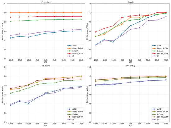 A comprehensive analysis of the four subplots in Figure 8 reveals that the IF model from traditional machine learning and the AINE model from evolutionary algorithms underperform across all metrics, with a significant gap compared to the other three models. Among the remaining models, both the Deep SVDD and the proposed LOF-OCSVM fusion model demonstrate excellent performance, while the E-GAN model slightly lags behind. This indicates that these two deep learning models are well-suited for radio anomaly detection tasks, and the proposed fusion model, by integrating two traditional machine learning models LOF and OCSVM, achieves performance comparable to deep learning models with outstanding results. Analyzing the performance of each model across metrics, it is evident that almost all models show improved performance as the ISR increases. However, the precision of the Deep SVDD model remains constant at 1.0 regardless of ISR changes. This is due to the unique characteristics of the Deep SVDD model: it is trained exclusively on normal data without requiring a preset contamination ratio. Nevertheless, to encompass all normal training data within the hypersphere, the model may set an excessively large radius, potentially enclosing some anomalous data and leading to increased missed detections. This is reflected in the recall and F1-score subplots, where despite its strong precision, Deep SVDD’s recall is unsatisfactory, dropping below 0.8 at ISR levels of −15 dB and lower. In contrast, while the proposed fusion model does not match Deep SVDD’s precision, it still maintains a precision above 0.95 even at the lowest ISR. Moreover, it exhibits a significant advantage in recall under low ISR conditions, resulting in a higher F1-score than Deep SVDD when ISR is below −5 dB. This demonstrates that the LOF-OCSVM fusion model effectively balances precision and recall, maintaining a high F1-score even under low ISR conditions.