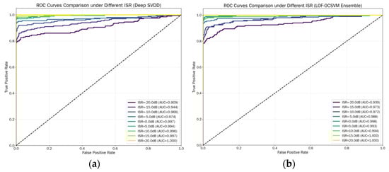 The above analysis reveals that both the Deep SVDD model and the proposed LOF-OCSVM fusion model demonstrate outstanding performance, with F1-scores exceeding 0.85 even at an ISR of −20 dB. Their overall performance is comparable, with the LOF-OCSVM fusion model achieving a higher F1-score under low ISR conditions, while the Deep SVDD model performs better at high ISR levels. To further compare the discriminative power of the two models in distinguishing between positive and negative samples, we plotted their ROC curves to illustrate the relationship between the true positive rate and false positive rate under different classification thresholds. The results are shown in Figure 9.