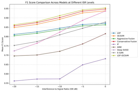 An overall analysis of Table 4 reveals that the proposed LOF-OCSVM hybrid model excels in both performance and stability. Specifically, under the lowest ISR, its recall and F1-score both surpass 0.8. This is mainly attributed to the model’s hierarchical decision-making mechanism. By integrating scores for an initial judgment and dynamically revising low-confidence samples based on the confidence of base models, it avoids the biases of single models. For instance, while the LOF model achieves high recall, it suffers from low precision, and the OCSVM model has high precision but low recall. Moreover, the LOF-OCSVM model demonstrates robustness with a standard deviation between 0.00 and 0.03. This is because the weighted integration strategy combines LOF’s local density sensitivity with OCSVM’s global boundary learning. The complementary nature of these two models reduces the impact of data fluctuations on detection results. When local data distribution changes, OCSVM’s global decision-making provides stability. When global data distribution shifts, LOF’s local density analysis can compensate for deviations. The base models and simple fusion models also meet robustness standards with a deviation between 0.01 and 0.03. However, they have performance shortcomings. The LOF model has a high average recall but a low average F1-score, indicating it focuses too much on local anomalies and misclassifies normal samples as anomalies, leading to low precision and a compromised F1-score. The OCSVM model has a high F1-score but lower average recall than LOF. This is because OCSVM relies on global boundaries in high-dimensional spaces and struggles to detect local weak anomalies. The aggressive and conservative fusion models consistently face a precision-recall trade-off and underperform compared to the LOF-OCSVM model. This indicates that simple decision-level fusion cannot match the advantages of weighted integration and hierarchical correction. The AINE model has comparable robustness but significantly lags in performance. This is because, under low ISRs, the subtle differences between weak interference and normal signals blur the self-sample boundaries of the AINE model, reducing its anomaly identification accuracy. Additionally, the high computational complexity of AINE’s immune network iteration process limits its performance potential in low ISR scenarios. In contrast, the IF, Deep SVDD, and E-GAN models show a marked increase in standard deviation. Their performance varies greatly across different datasets, indicating poor robustness and significant fluctuations in performance metrics. The IF model performs the worst with low average metrics and high variance. This may be due to its sensitivity to data distribution randomness. When local data density varies with different random seeds, the structure of isolated trees changes significantly, causing detection results to fluctuate. Deep SVDD and E-GAN also perform poorly in terms of average metrics and standard deviation. Deep SVDD may inadvertently enlarge the hypersphere containing normal samples, including some anomalies. E-GAN suffers from unstable training, mode collapse, and high sensitivity to data distribution changes. These issues exacerbate performance fluctuations across datasets.