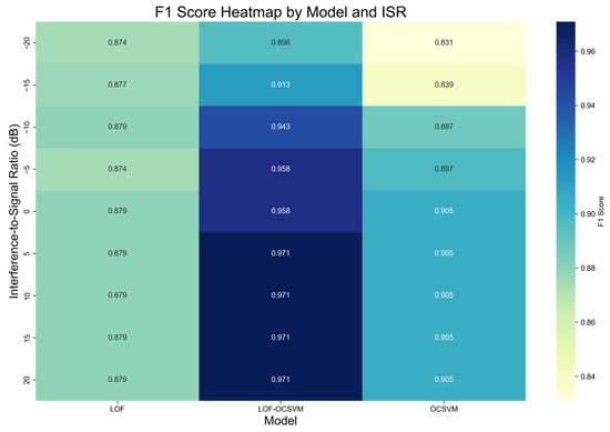 As shown in the F1-score heatmap of the RML2016.10a dataset, the LOF-OCSVM model still has remarkable performance improvement compared to single base models. The LOF model’s scores are stable but with light colors, indicating limited superiority. The OCSVM model is most affected by ISR, with poor performance and stability under low ISRs. The LOF-OCSVM model shows dark-colored areas across the ISR range, meaning high and evenly distributed F1-scores. At −20 dB ISR, its F1-score is approximately 2% and 8% higher than the LOF and OCSVM models, verifying the effectiveness and generalization ability of the method in near–real scenarios.