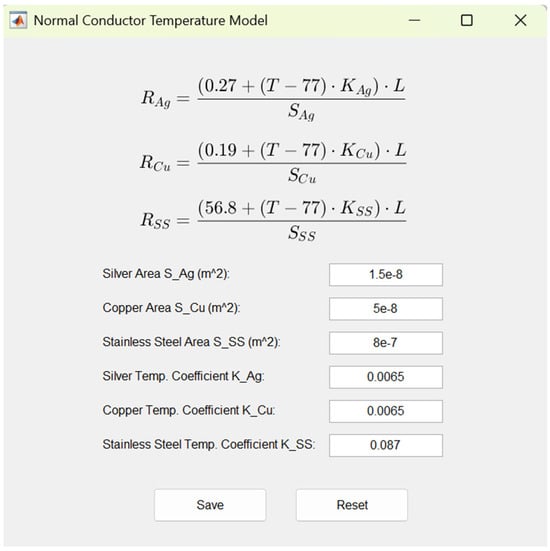 where KAg, KCu, and KSS are the resistivity temperature coefficients of silver, copper, and stainless-steel, respectively; SAg, SCu, and SSS are the cross-sectional areas of the silver, copper, and stainless-steel layers, respectively; and L is the length of the tape. Note that 0.27, 0.19, and 56.8 are the resistivity of silver, copper, and stainless-steel at 77 K, in units of 10−8 Ω·m.