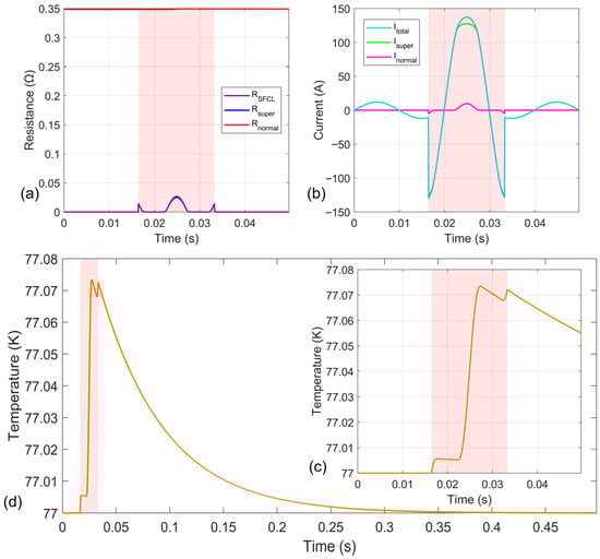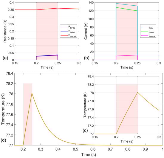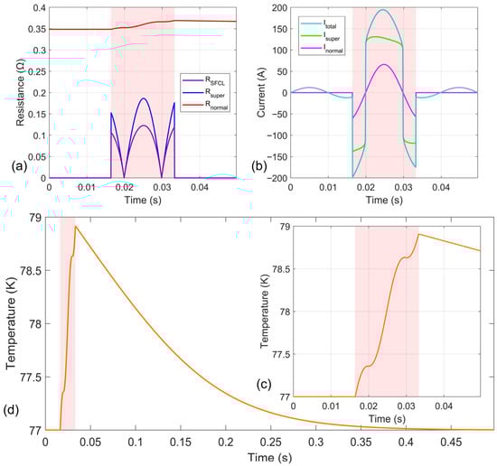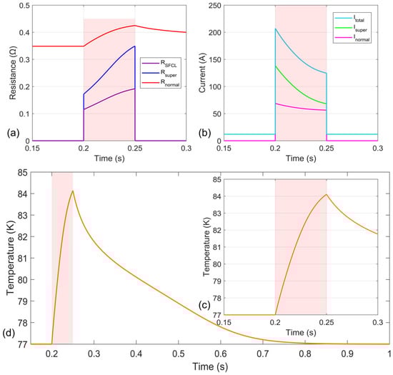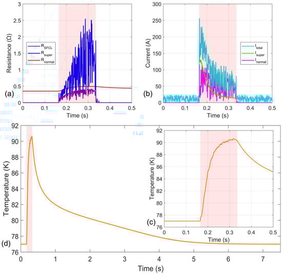 Figure 11a,b also show the change curves of the total resistance and total current of the RSFCL, respectively. During normal operation, the current limiter resistance is close to 0 Ω, equivalent to a wire connected in series with the circuit. At 0.203 s, the total resistance increases to 0.12 Ω, limiting the fault current to 207 A. During a short-circuit fault, both the superconducting resistance and the resistance of other material layers increase continuously with rising temperature, causing the total current to decrease steadily, with the trend gradually flattening. At 0.25 s, the total resistance increases to 0.19 Ω, and the fault current decreases to 125 A.