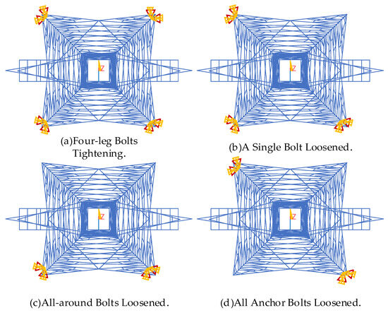 Using Beam188 elements, the geometric model of the transmission tower was discretized. Four different states of anchor bolt loosening were analyzed, and the corresponding models for these states are illustrated in Figure 2.
