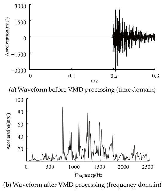 To intuitively demonstrate the processing effect of VMD on bolt loosening acoustic signals, Figure 3 presents the signal waveforms before and after VMD processing: (a) is the original signal before VMD time-domain processing, and (b) is the decomposed result after VMD frequency-domain processing.