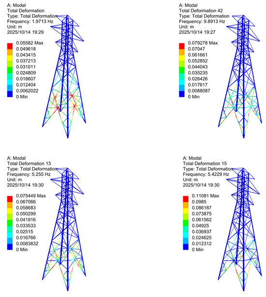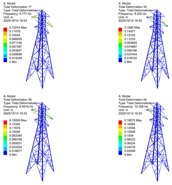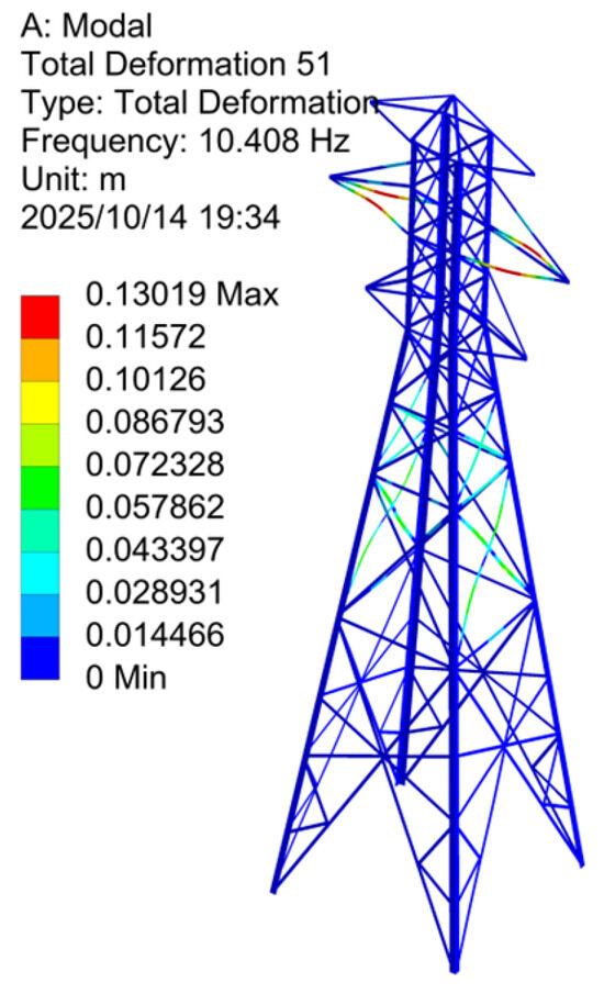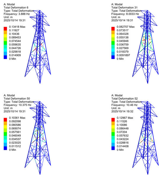 Based on the location of the vibration, local mode shapes can be further classified into four types: lower section vibration (as shown in Figure 4), middle section vibration (as shown in Figure 5), upper section vibration (as shown in Figure 6), and mixed vibration (as shown in Figure 7). The tower modeling and data analysis were conducted in ANSYS 2024 R1.