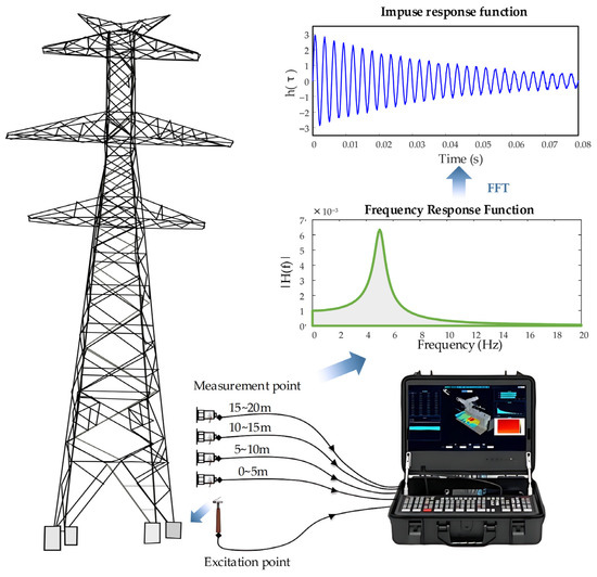 Based on simulation analysis, it can be inferred that when the main and bracing members at the tower base are excited, the resulting vibration response is primarily dominated by the local and global modes of the lower tower section. Consequently, if excitation is applied to the lower section of the transmission tower, bolt loosening in this region can be identified with a high probability. Conversely, detecting bolt loosening in the middle or upper sections poses significant challenges. Therefore, it is sufficient to excite the base of the tower during the experiment.