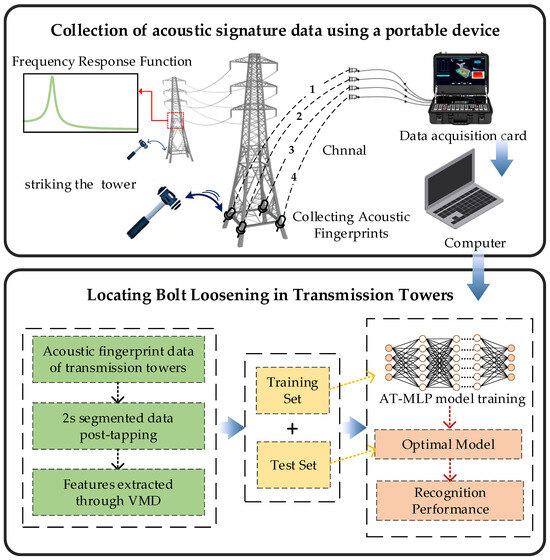 In contrast, data-driven methods have emerged as a promising alternative, leveraging advances in machine learning and sensor technology to address complex scenarios. In their study, Wang et al. [10] proposed a time–frequency feature extraction method based on Short-Time Fourier Transform (STFT). By combining STFT with image processing techniques, they were able to identify loosening states. This method exhibits a strong anti-noise capability and is suitable for early loosening monitoring, but its high computational complexity compromises real-time performance. Hou et al. [11] proposed a bolt loosening identification method based on acoustic signal analysis, genetic algorithm-optimized support vector machine (GA-SVM), and recursive feature elimination (RFE). This method utilizes wavelet packet energy spectrum analysis to detect complete loosening through abrupt changes in frequency band energy. It offers high sensitivity and a simple, clear energy ratio threshold setting, but it is sensitive to the placement of sensors. Sui et al. [12] proposed a method based on SH-type-guided waves, utilizing a small number of magnetostrictive transducers to detect and locate bolt loosening in multi-bolted connections. They incorporated noise-injection learning during the training process to improve the localization accuracy of bolt loosening. Zhao et al. [13] investigated the influence of bolt pre-loading on tower modal parameters and found that the shift in natural frequency could serve as a loosening indicator. While suitable for overall structural monitoring, this method has low sensitivity and requires high-frequency excitation. From a nonlinear dynamic perspective, Yang et al. [14] analyzed the subharmonic and chaotic characteristics of bolt loosening. This method provides a deeper understanding of the loosening dynamics mechanism, but it requires further adaptation to the actual working conditions of transmission towers. Zhao et al. [15] decomposed the transmission tower vibration response into low-frequency signals (2–25 Hz) and high-frequency signals (25–75 Hz). They processed these signals using adaptive Chirp mode decomposition and singular value decomposition to remove signal outliers caused by pulse excitation and employed the wavelet packet transform to eliminate forced vibrations. They then proposed a fault diagnosis model based on Timesnet and Transformer. Dong-Yoon Kim et al. [16] proposed a detection method based on Variational Mode Decomposition (VMD). This method uses VMD to decompose the transverse vibration mode into Intrinsic Mode Functions (IMFs), thereby selectively extracting signals with the desired mode. The NT method is then applied to the extracted signals for scaling and shifting, converting them into a form that is easy for approximate classification. Chen et al. [17] proposed a smart detection method based on a multi-scale one-dimensional convolutional neural network. This method automatically learns deep features from vibration signals by constructing a multi-scale feature extraction network, achieving end-to-end bolt loosening diagnosis. However, it requires a large amount of labeled data for training, which presents a data acquisition challenge in practical engineering applications. The effectiveness of tapping-based acoustic methods is diminished by noise interference. Existing solutions are difficult to scale to a full-range tower system, and the variability in striking force and structural dynamics in practical applications has not been addressed. It is noteworthy that experimental analyses of staggered double-bolted connections [18] and adjustable foundation bolts [19] have revealed the current framework’s inadequacy in simulating complex multi-bolt interactions, further highlighting the necessity for a system-level solution. Furthermore, the fusion of multi-modal data, such as acoustic signals, vibration data, and visual information, presents a promising avenue for future research.