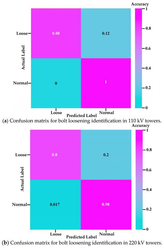 As illustrated in Figure 14, the correct recognition rates for loosened bolts in the 110 kV and 220 kV towers reached 88% and 80%, respectively, while the recognition rates for normal bolts were 100% and 98%. These results indicate that the method largely meets practical requirements for bolt loosening detection in transmission towers.