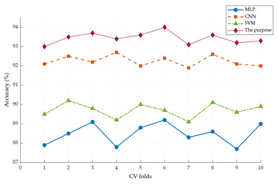 Figure 15 demonstrates the consistently superior cross-validation accuracy of AT-MLP compared to the other models. Under this unified training configuration, the performance comparison in Table 8 is highly reliable: the CNN extracts spatial features via convolutional layers, but due to the absence of adversarial training, it exhibits limited robustness against environmental noise and structural variations. In contrast, the AT-MLP achieves the highest accuracy of 93.4%, benefiting from adversarial training—a conclusion further supported by subsequent PCA-based feature distribution analysis in Figure 16.