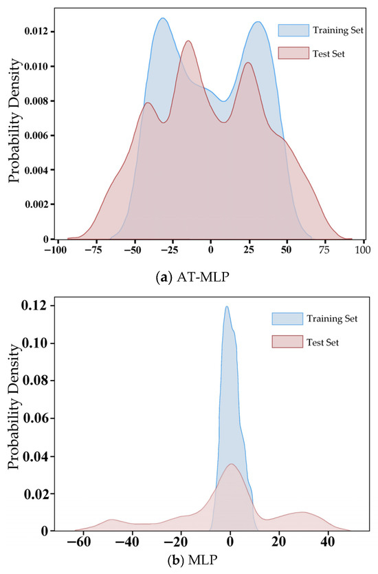 This study employed Principal Component Analysis (PCA) to reduce the dimensionality of the feature data output by the feature extraction network. The probability density distributions of both the training and test sets were then estimated to illustrate the capability of adversarial training in mitigating interference factors. As visualized in Figure 16 for the 220 kV tower bolt dataset, the feature distributions of the test set and training set exhibit greater similarity after adversarial training. In contrast, the feature distribution generated by the standard MLP without adversarial training showed significant discrepancies.
