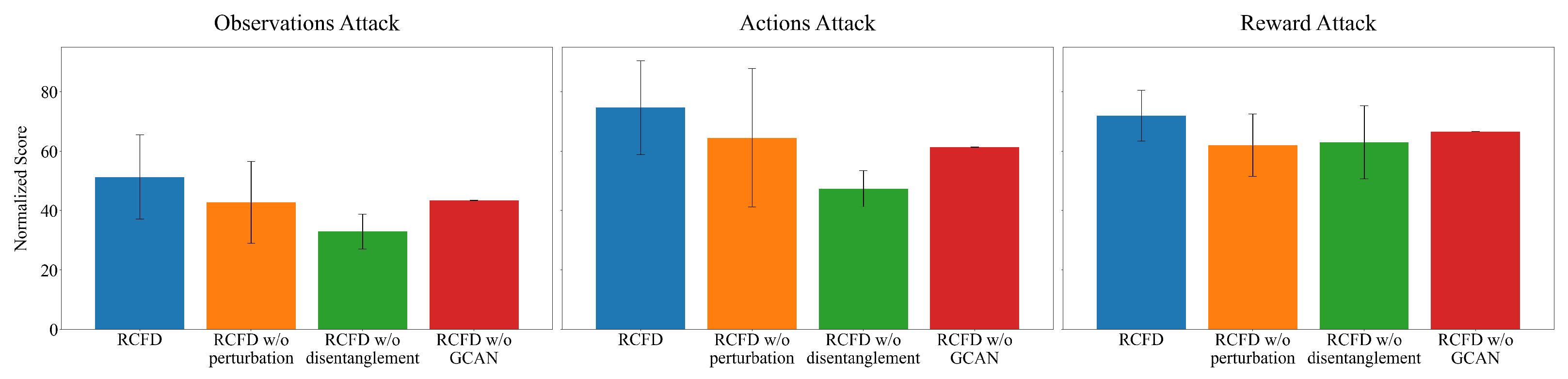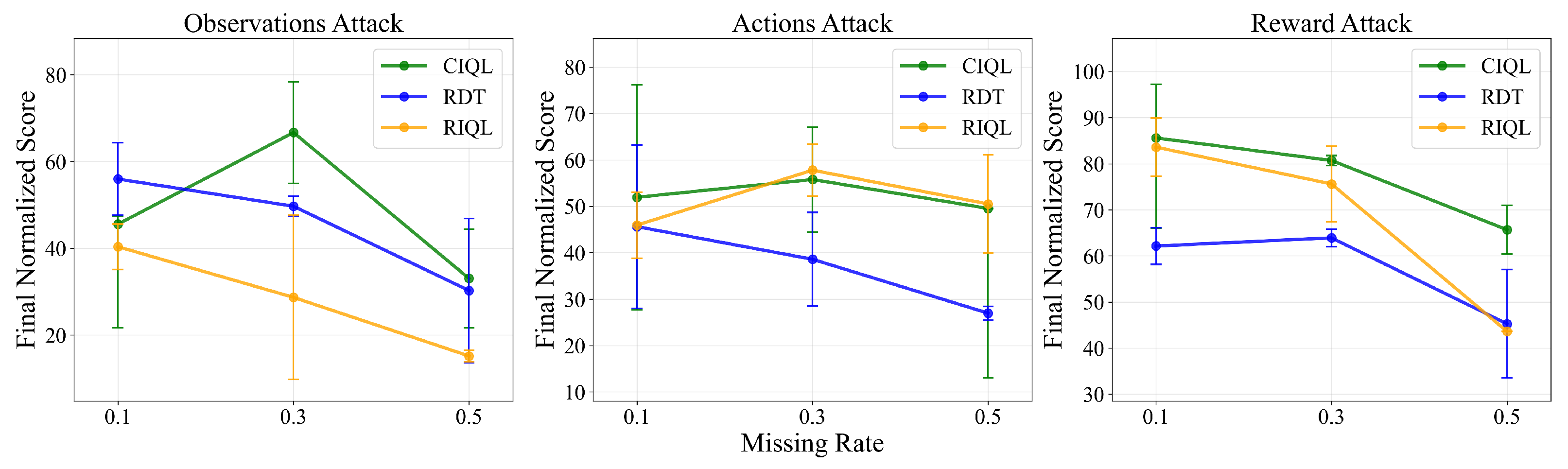 - Random reward attack: For randomly selected samples, we replace original rewards with . The amplification factor is employed because offline reinforcement learning algorithms exhibit natural resistance to small-scale reward perturbations but experience performance collapse under large-scale corruption conditions.
