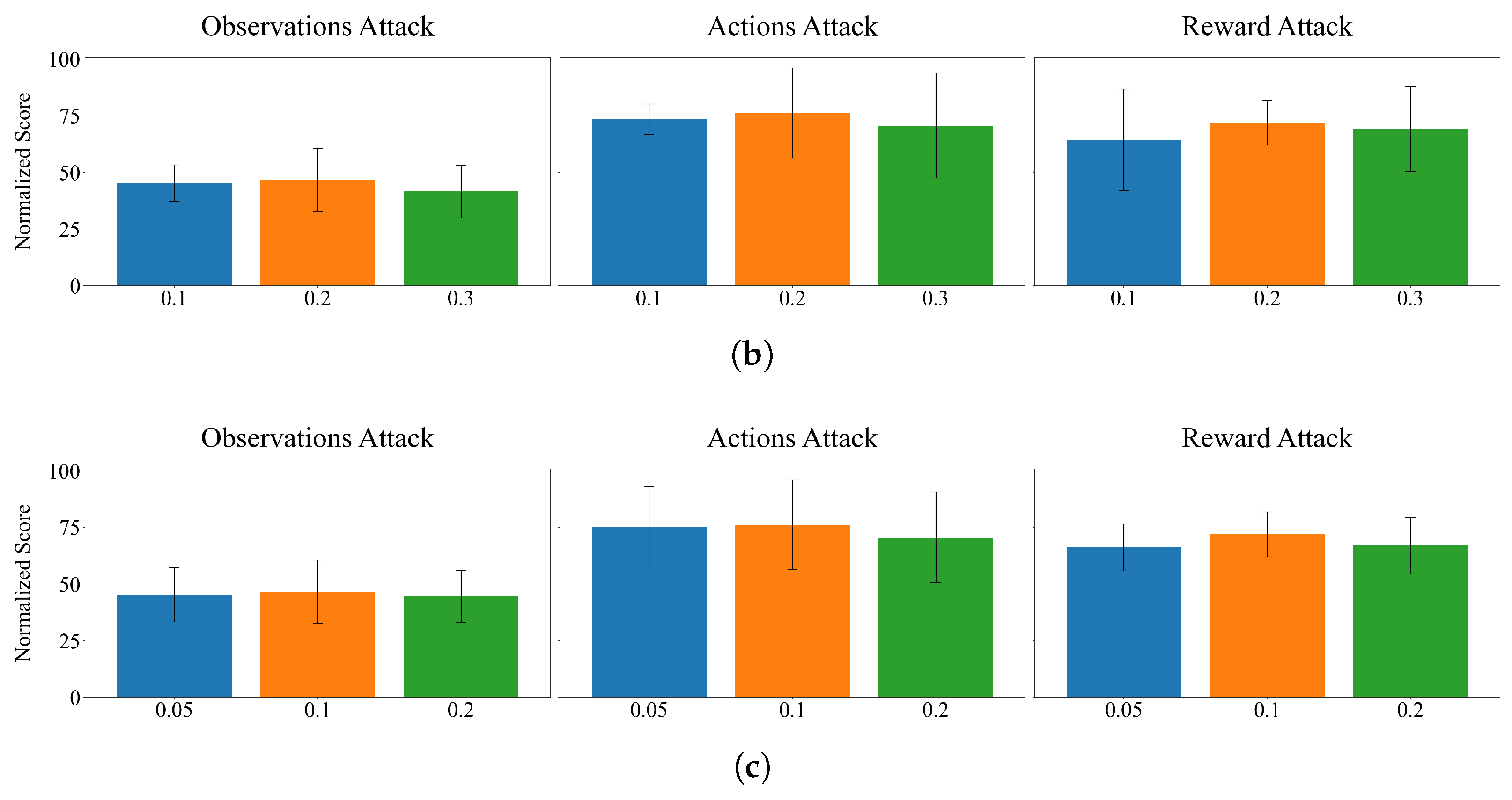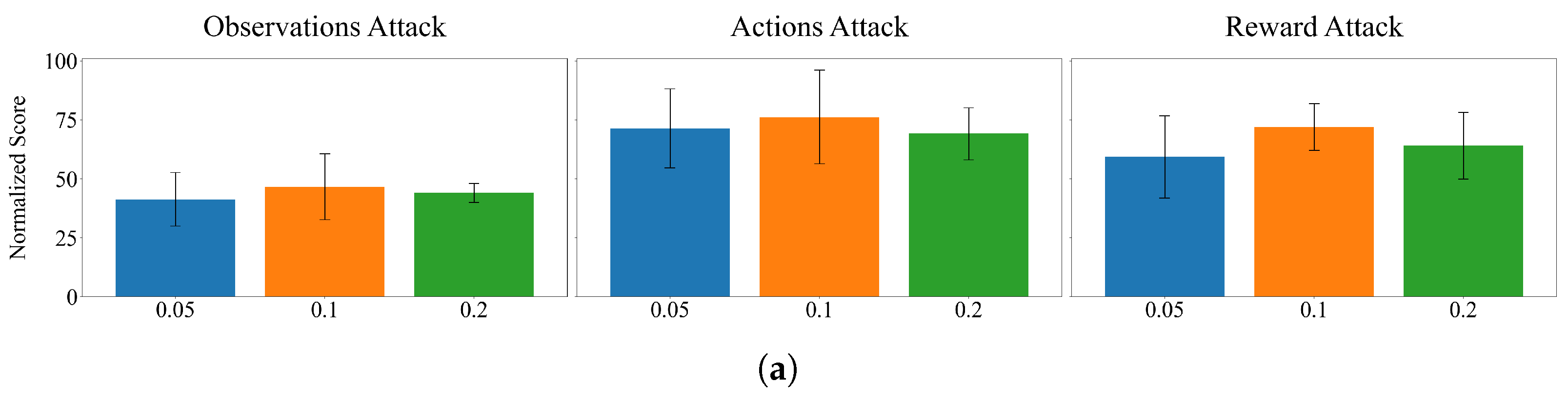 - Random action attack: Using the same sampling rate , we select state transition samples and apply perturbations to the actions , where , is the action dimensionality and represents the dimensional standard deviation of the action space.