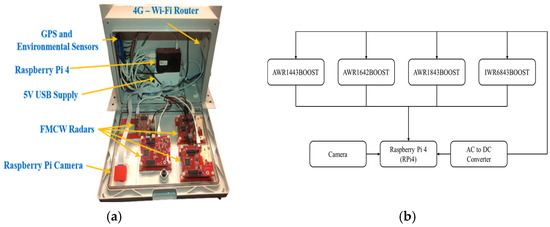 The Radar and Video Acquisition Subsystem (RVAS) consists of four FMCW radar sensors, namely the AWR1443BOOST, AWR1642BOOST, AWR1843BOOST, and IWR6843ISK. These devices operate across the 60–64 GHz (for the IWR6843ISK) and 77–81 GHz (for the remaining devices) frequency bands [19]. A Raspberry Pi 4 (RPi4) is employed as an edge processing and control unit. The RPi4 is tasked with the radar sensors’ functionality control and data acquisition and recording, while at the same time it is connected to a compatible camera for video footage capture—see Figure 1a for a photo of the proposed platform and its main modules, and Figure 1b for a block diagram of the RVAS. In Figure 1a specifically, it can be observed that the radar sensors are arranged in a way that their antenna array axes are vertical, and mounted on custom-designed, 3D-printed plastic supports, ensuring optimal dock targeting during port approaches.