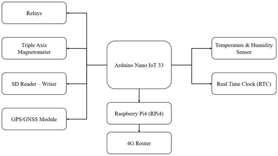 The Management and Communications Subsystem (MCSS) is responsible for managing power distribution, environmental monitoring, and wireless local and cloud communications. At the core of the MCSS is an Arduino Nano that is used to reliably control a series of critical environmental sensors (temperature and humidity), the GPS/GNSS module, a triaxial magnetometer, and a series of power relays. The MCSS is supervised by the RPi4 that also serves as an intermediate link with the RVAS. According to Figure 1a, the Arduino Nano is located above the GPS and environmental sensors and, at least in Figure 1a, it is hidden behind the enclosure’s brim. A connectivity diagram of the MCSS is provided by Figure 2 below.