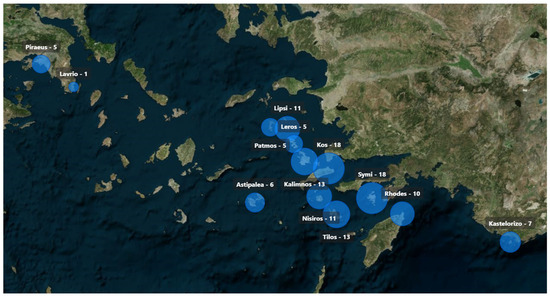 Visual representation of the port and the number of the “Arrival” data collected. Circle size corresponds to the percentage of arrival data for each port vs. the total arrival data collected.