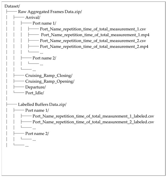 The dataset is organized into two main folders, namely “Raw Aggregated Frames Data” and “Labelled Buffers Data”. The former is divided into five operational categories (Arrival, Cruising–Ramp Closing, Port–Idle, Cruising–Ramp Opening, and Departure)—as described in Table 2. Within each category, the recordings are further divided based on the port where they were collected, resulting in 13 port-specific subfolders. Each subfolder contains pairs of files for every recording, i.e., (i) a Comma-Separated Values (CSV) file with structured Raw Aggregated Frames Data from each radar, including timestamps, radar detections and vessel operational states, and (ii) the corresponding synchronized video in MP4 format. This organization is consistent across the dataset. As long as the “Labelled Buffers Data” main folder is concerned, it further contains an extra folder that includes the data category classes following the same aforementioned hierarchy. Furthermore, the folder “Labelled Buffers Data” does not contain any video files since they are already available in the unlabeled dataset. A visual representation of the hierarchy is shown in Figure 6 below.