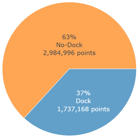 Out of all data categories (Arrival, Cruising–Ramp Closing, Port–Idle, Cruising–Ramp Opening, and Departure), it is considered the Arrival subsection is the most crucial for navigation safety in close quarters, and this is the one that we further focus our analysis on. In this context, we herein also provide a detailed analysis for a better understanding of its content. More specifically, the Arrival category consists of 123 recordings that consist of 508 min and 609,100 rows of data in total, containing a total of 4,722,164 points. Of these, 1,737,168 points correspond to the Dock, while the remaining 2,984,996 points represent noise and other objects that are not traceable. The imbalance in the distribution of points can be seen in Figure 7, where the Dock accounts for 37% of the total points, while the remaining 63% correspond to other, non-traceable elements. This distribution reveals that the two classes occupy different proportions of the total recording time, which is expected since, throughout all arrivals, the Dock class appears for only a relatively short portion of each sequence. This imbalance reflects the dynamics of the berthing process: for most of the duration, the radar primarily detects transient elements such as the ferry ramp, vehicles, or miscellaneous dockside objects, whereas the actual dock is observed for a much shorter period.