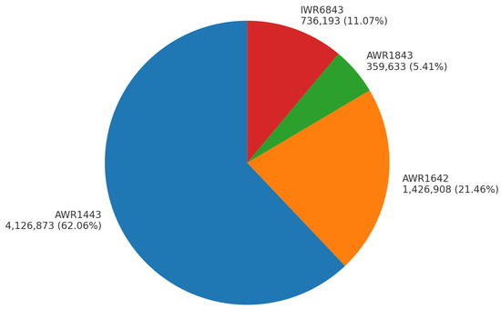 Another perspective on the dataset is to examine the relative contribution of each radar to the overall number of detections, irrespective of whether a point corresponds to the dock, noise, or other reflections. As shown in Figure 8 both the absolute counts and percentages of points are reported, summing to a total of 6,649,607 detections. A notable observation is that the AWR1443 alone contributed more than 62% of the points, while the other radars contributed substantially fewer detections. This imbalance is not an artifact of the environment but is primarily due to the different CFAR configurations applied on each radar during data collection (Table 1). In particular, although all devices used similar window, guard, and noise averaging parameters, the AWR1443 was configured with a lower CFAR threshold scale (15 on a 0–100 dB scale), resulting in significantly more detections being reported compared to the other radars. These settings were deliberately selected to ensure stable operation of all devices, as during initial trials some radars experienced processing crashes under heavy loads (many detected objects in one frame).