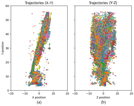 By observation of the X-Y plane, it follows that the apparent dock elevation is reduced as the ship approaches the dock. This is expected since the radar sensors were mounted with an inclination angle of 12° as discussed in Section 2 (see also Figure 1 and Figure 3). On the other hand, the Y–Z plane is a top view of the scene, and one may observe that the trajectories are randomly distributed across the scanned area, capturing a wide variety of ship approach paths. It follows that the proposed dataset includes a comprehensive range of berthing maneuvers, covering different approach angles and docking trajectories, which reflect a realistic operational variability.