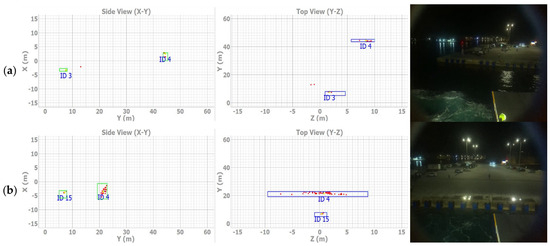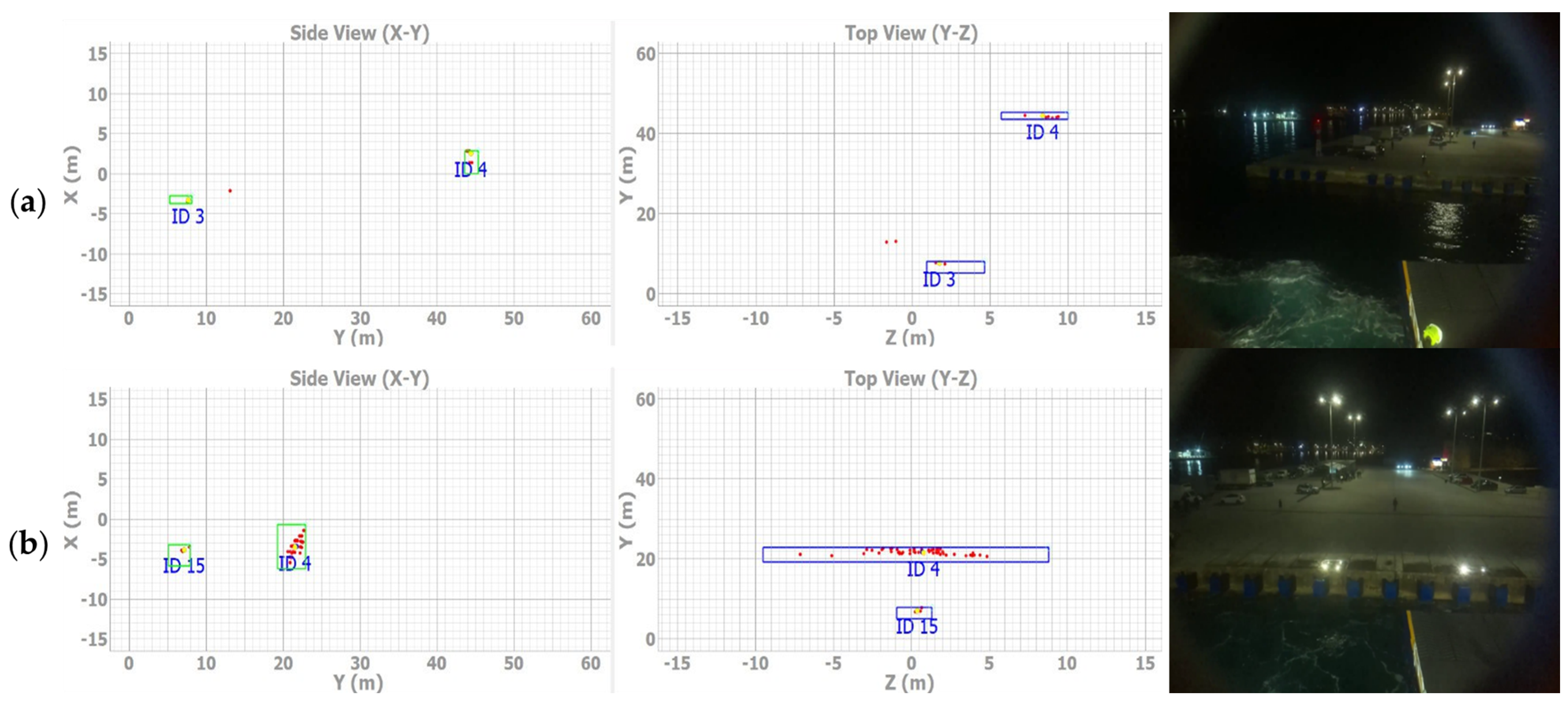 Figure 10 illustrates the combined visualization of radar-based clustering and tracking alongside synchronized camera footage during two distinct timeslots within a berthing maneuver. In the radar plots, red dots represent the raw radar detections, while green and blue rectangles indicate clusters identified by DBSCAN and tracked by Kalman filtering. The subplots provide two perspectives of the same detections: the side view (X–Y plane) shows the lateral spread of points along the berth, while the top view (Y–Z plane) projects the detections as seen from above, revealing their distance from the radar and their vertical distribution.