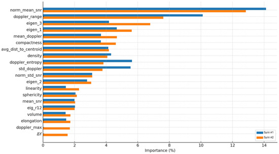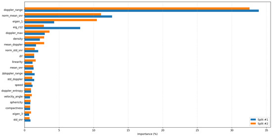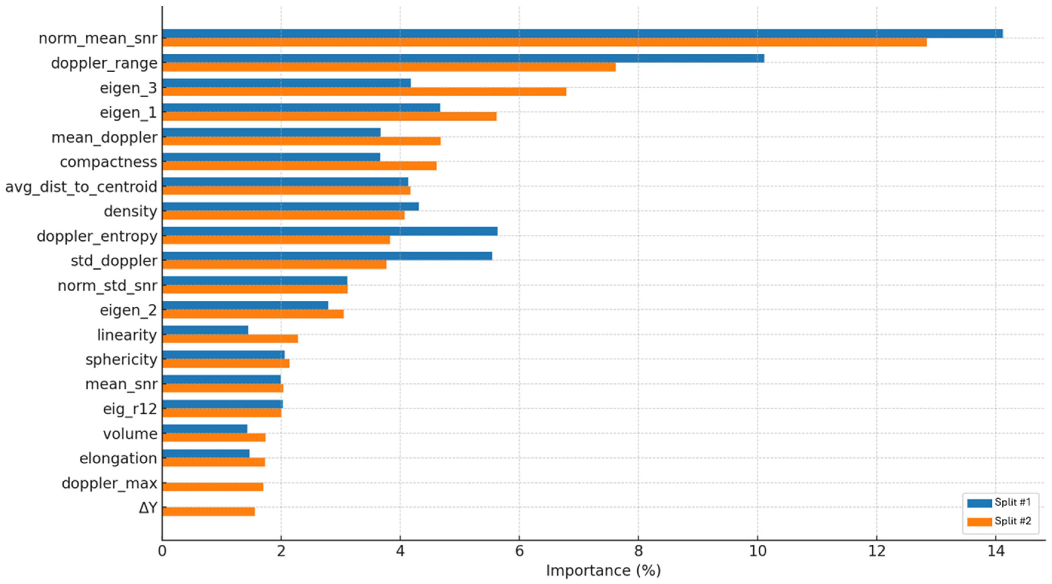 The second most important feature is “norm_mean_snr”, which consistently ranks high across both splits. This measure of normalized reflection strength indicates that dock surfaces have distinctive SNR returns, in contrast to the various other detected clusters. Eigenvalue-based geometric descriptors, particularly “eigen_1” and “eig_r12”, also contribute meaningfully, emphasizing the role of structural shape in complementing Doppler and intensity cues.