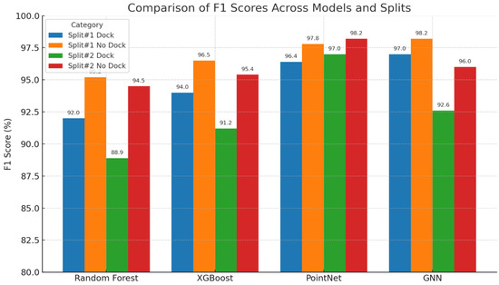 To provide a clear overview of the classification results, the F1-scores of all evaluated models (Random Forest, XGBoost, PointNet, and Graph Neural Networks) are summarized and compared in Figure 14. The distribution highlights that PointNet achieved the best overall performance, reaching up to 98.2% for the No-Dock class and 97.0% for the Dock class, while GNNs followed closely with slightly lower stability across dataset splits. In contrast, the feature-based models (Random Forest and XGBoost) achieved lower F1-scores, particularly in the Dock class of Split #2, indicating less robust generalization when tested on unseen ports. This comparison underscores the advantage of deep learning models that can directly interpret raw radar point cloud data over feature-based approaches.
