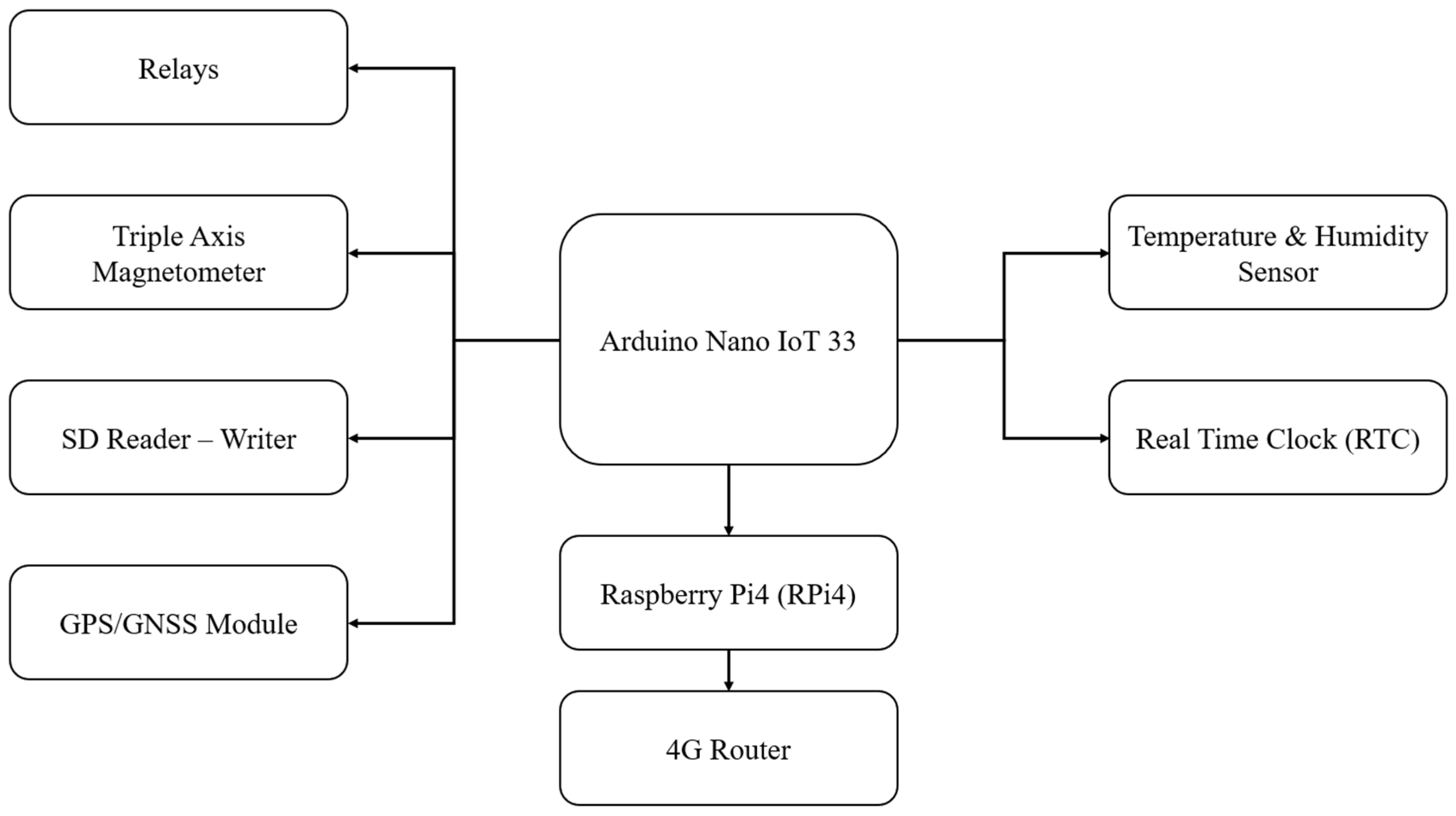 The Management and Communications Subsystem (MCSS) is responsible for managing power distribution, environmental monitoring, and wireless local and cloud communications. At the core of the MCSS is an Arduino Nano that is used to reliably control a series of critical environmental sensors (temperature and humidity), the GPS/GNSS module, a triaxial magnetometer, and a series of power relays. The MCSS is supervised by the RPi4 that also serves as an intermediate link with the RVAS. According to