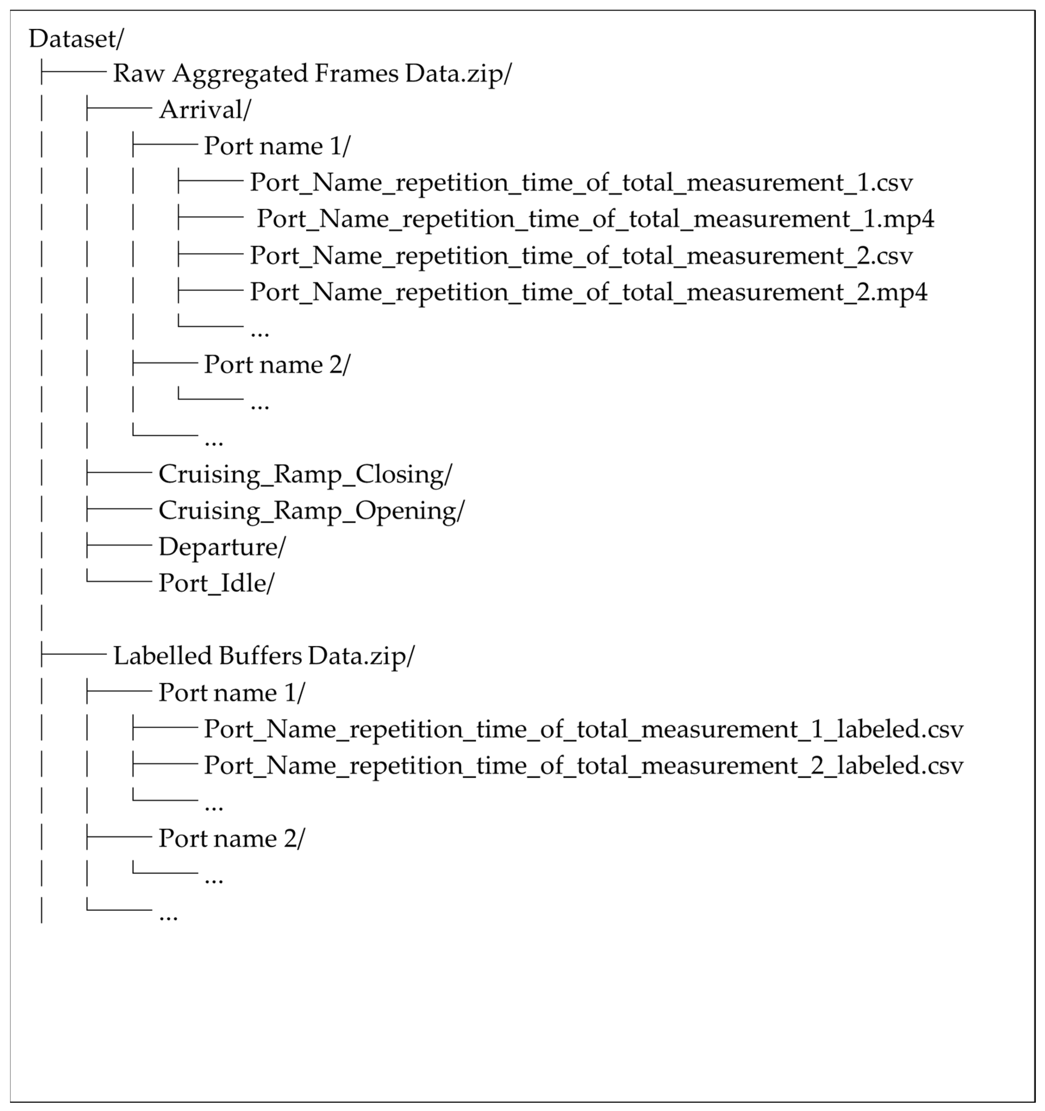 To facilitate structured access, the recorded sessions were organized per port and docking attempt. The port label denotes the geographical location of each operation (e.g., Kalimnos, Patmos, Rhodes), while the docking attempt index reflects the sequential number of visits to the same port during dataset creation (e.g., Kalimnos_3 indicates the docking of the ship at the Kalimnos port, during a subsequent approach on a different date). This two-level hierarchy data organization enables both cross-port comparisons and intra-port analysis across multiple repetitions of similar maneuvers.
