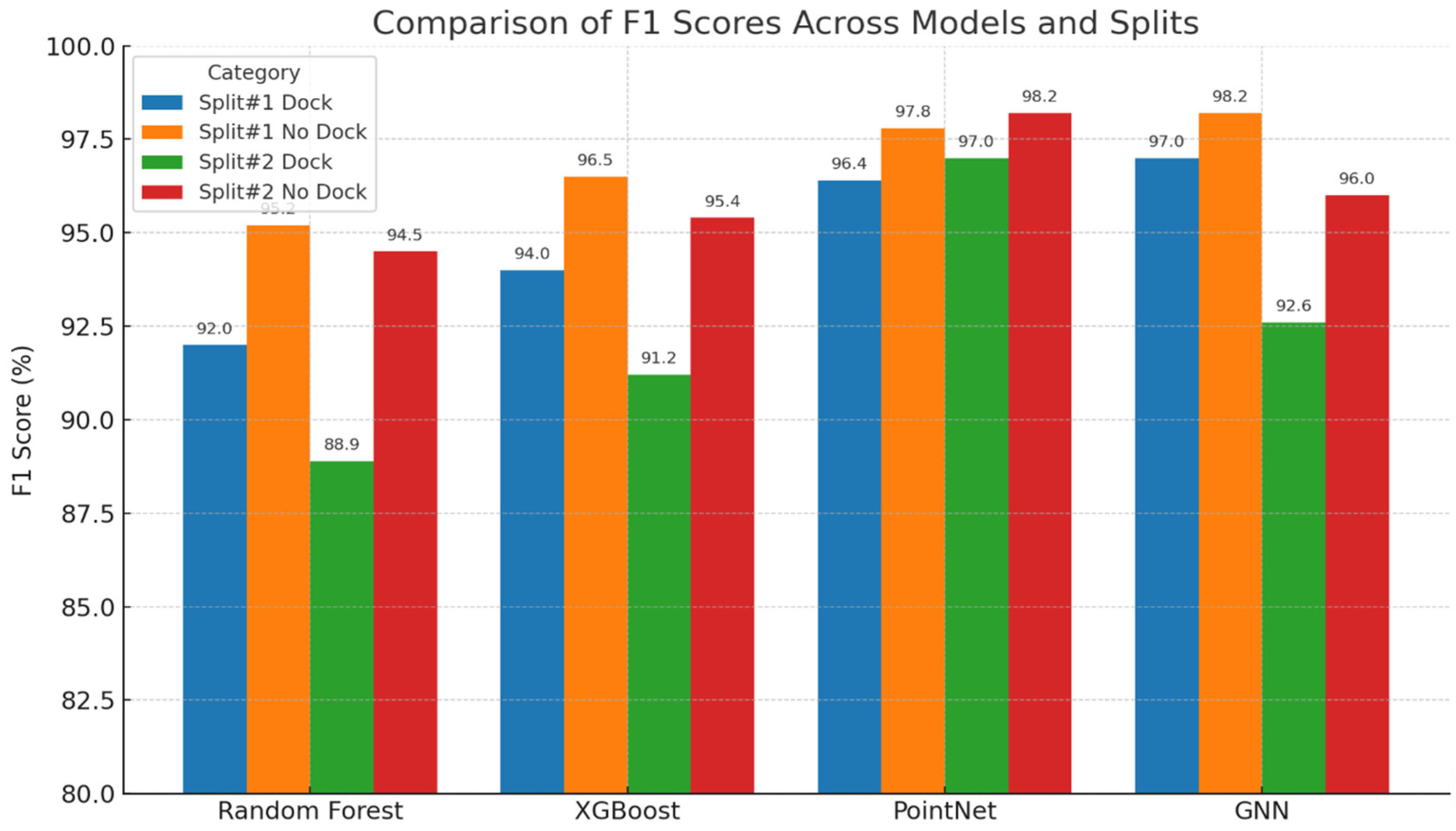 Figure 14. The distribution highlights that PointNet achieved the best overall performance, reaching up to 98.2% for the No-Dock class and 97.0% for the Dock class, while GNNs followed closely with slightly lower stability across dataset splits. In contrast, the feature-based models (Random Forest and XGBoost) achieved lower F1-scores, particularly in the Dock class of Split #2, indicating less robust generalization when tested on unseen ports. This comparison underscores the advantage of deep learning models that can directly interpret raw radar point cloud data over feature-based approaches.