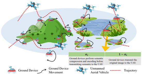 We consider a multi-UAV semantic communication network for image transmission and random device movement in an intelligent disaster rescue scenario, as shown in Figure 1. The set represents I ground devices equipped with small computing units, and the set represents J UAVs maintaining a fixed altitude H.