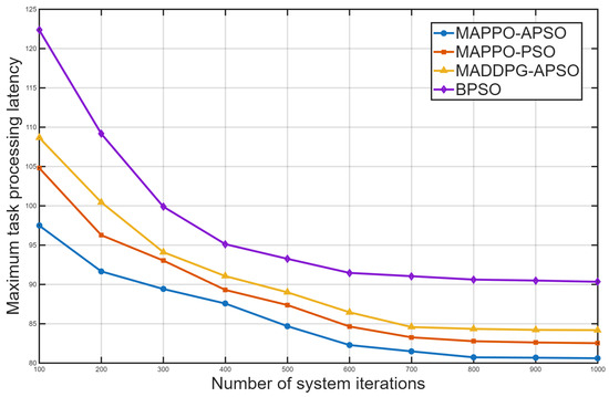 Figure 3 compares the convergence of four algorithms in reducing maximum task processing latency. All algorithms decrease energy consumption and stabilize over iterations, with the proposed MAPPO-APSO achieving the fastest convergence and lowest delay—outperforming others by 2.4%, 4.3%, and 10.8%.