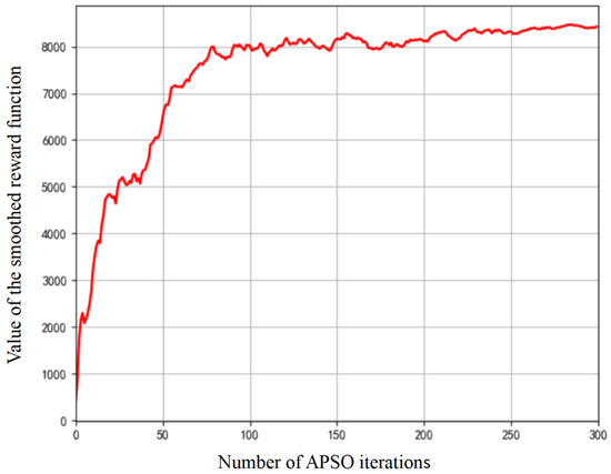 The alternating and asynchronous feature of the proposed MAPPO-APSO method requires primary focus on the convergence of these two algorithms individually. Figure 4 and Figure 5 show the convergence of MAPPO and APSO algorithms. MAPPO’s reward grows rapidly in 600 iterations before stabilizing and converges in 2000 iterations, proving effective for UAV associations and trajectories. APSO converges faster in 100 iterations, optimizing power, offloading, and compression. The observed discrepancy in convergence iterations stems from the fundamental roles of each algorithm: MAPPO learns a high-dimensional policy over many steps, while APSO efficiently solves sub-problems within a well-defined, lower-dimensional search space during each policy iteration. The convergence of the MAPPO and APSO algorithms ensures that the overall MAPPO-APSO system achieves optimal performance.