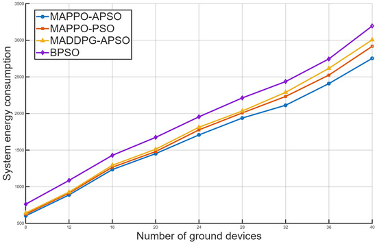 Comparison of system energy consumption among four algorithms with varying ground devices.