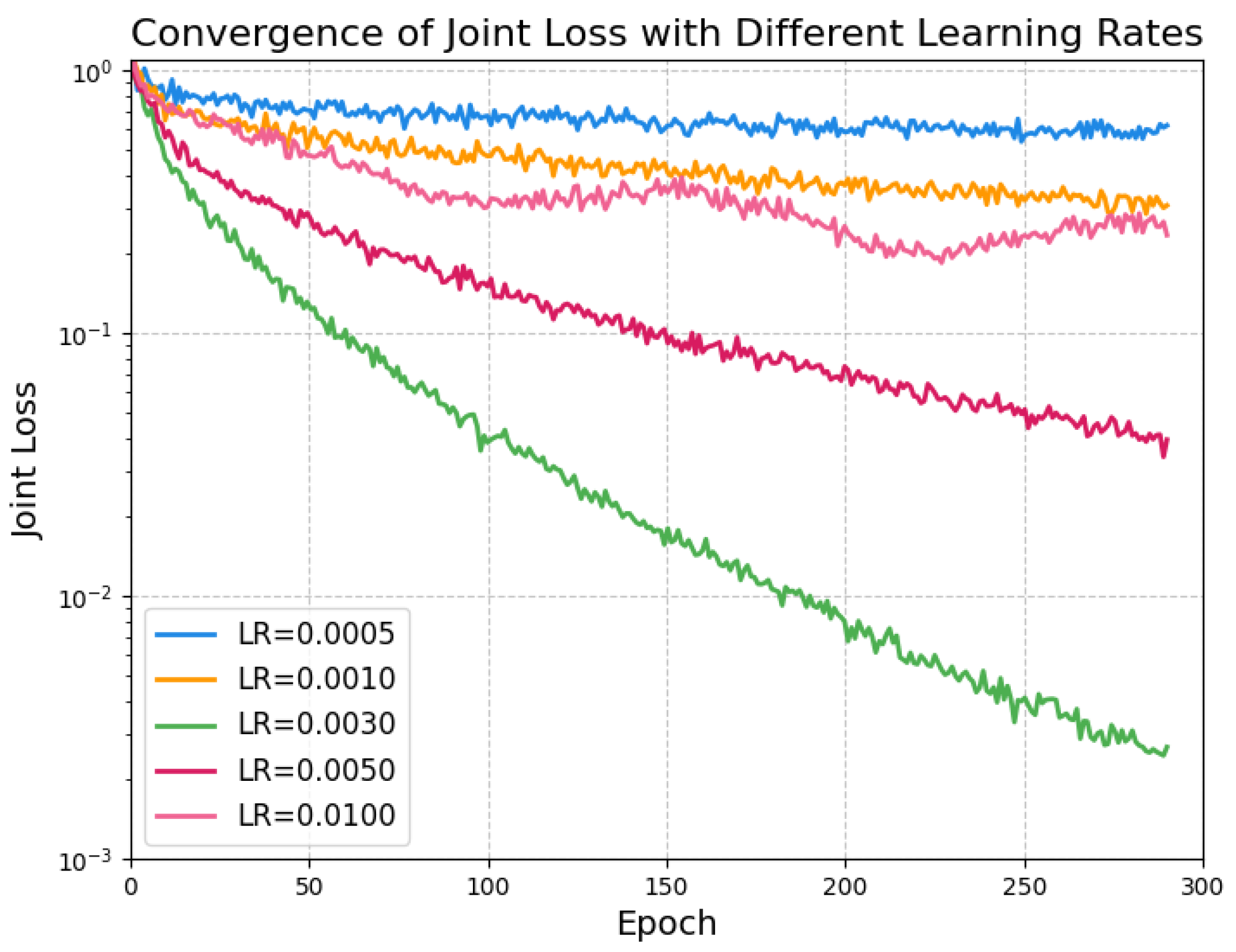 achieves the lowest joint loss after 300 epochs, balancing convergence speed and stability, while lower rates (e.g.,