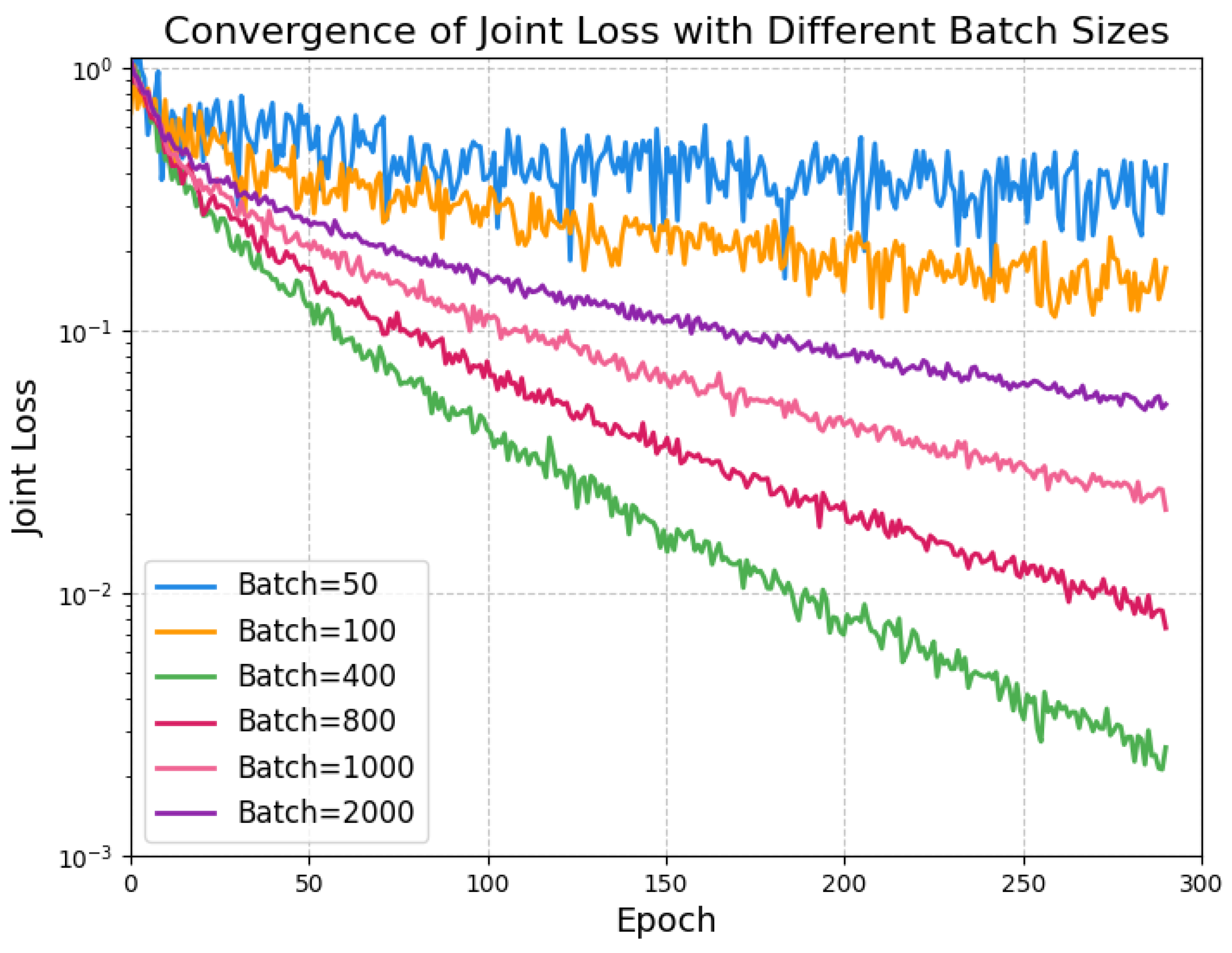 Figure 5 depicts the joint loss versus epoch for different batch sizes (