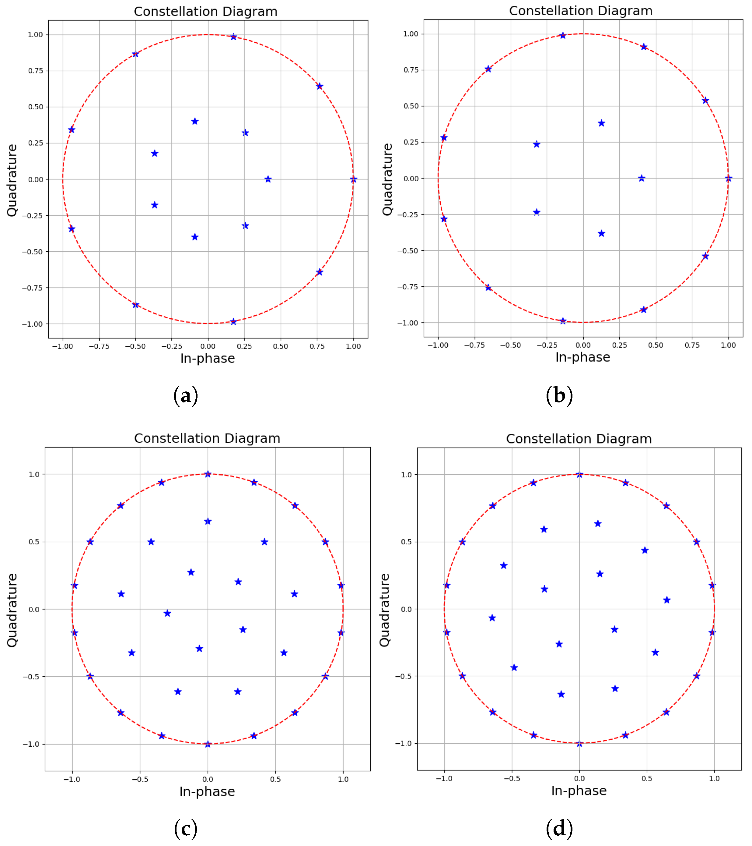 Figure 9, the proposed DNN-optimized constellation achieves PSLR improvements of approximately 5.8 dB, 4.6 dB, and 0.4 dB over 16QAM, 16PSK, and 16APSK. Specifically, 16QAM exhibits higher sidelobes due to its significant and unstructured amplitude variations. In contrast, 16PSK, with its fixed-amplitude constellation, offers a constant envelope but relies solely on phase shifts. For 16APSK, the structured multi-ring design incorporates controlled amplitude variations alongside phase modulation, enabling better statistical decorrelation in the time domain and thus lower sidelobes compared with 16QAM and 16PSK, though remaining inferior when compared with the DNN-optimized approach.