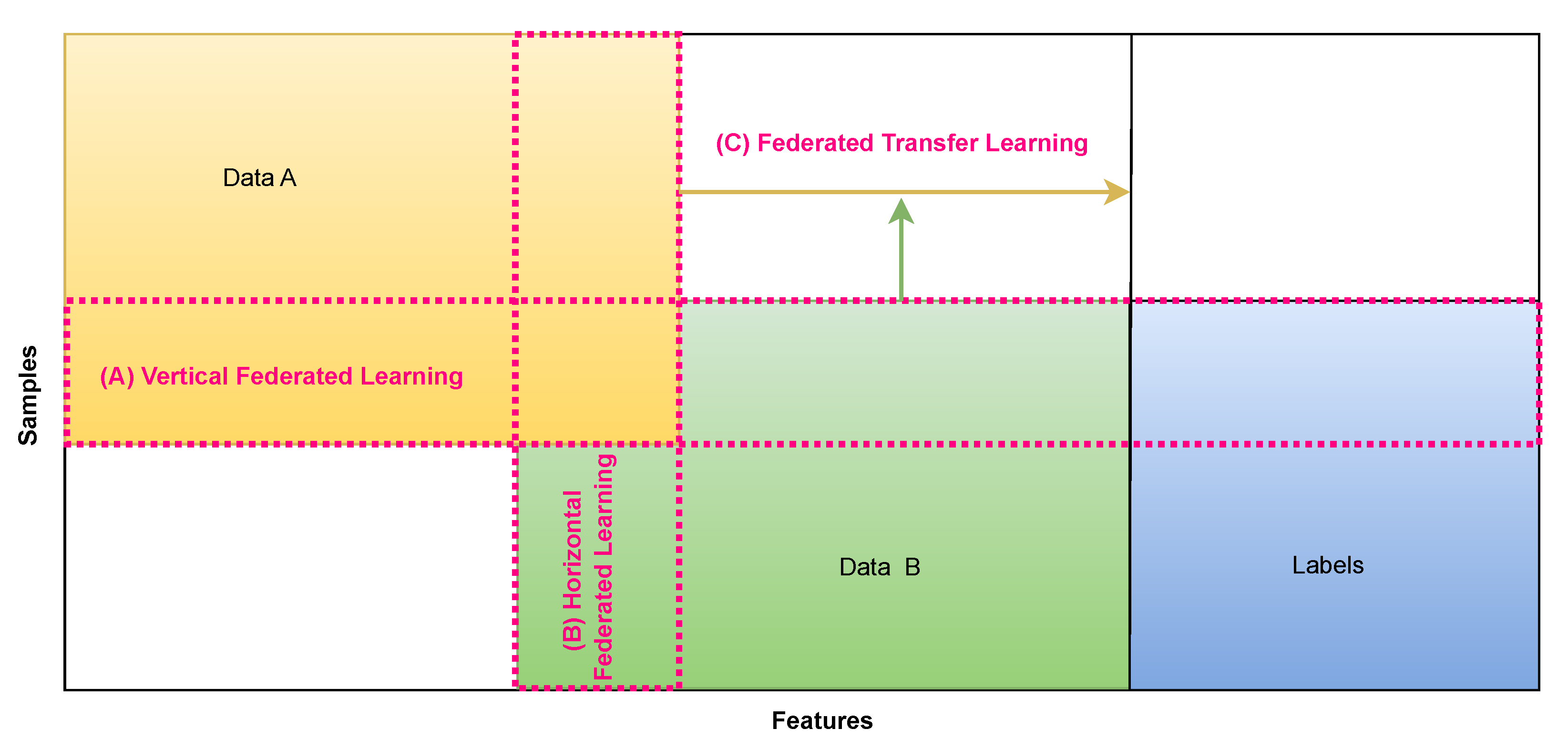 FL can be categorized into three types based on the data sample space and data feature space distribution among participants. These categories include vertical federated learning, horizontal federated learning, and federated transfer learning. Ref. [