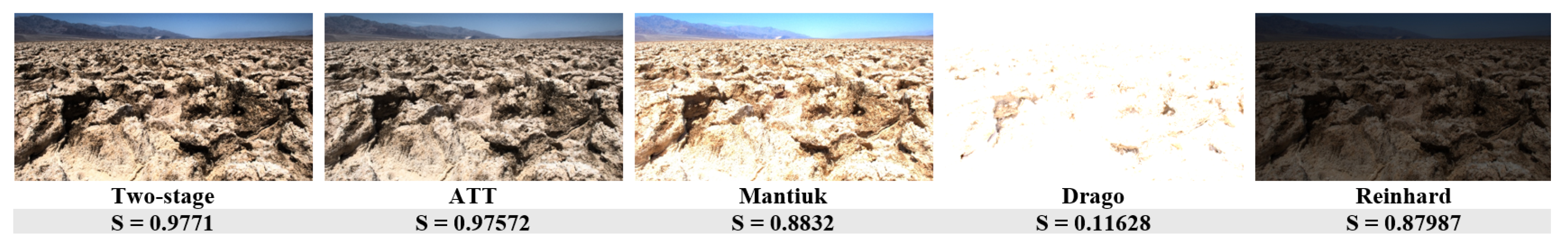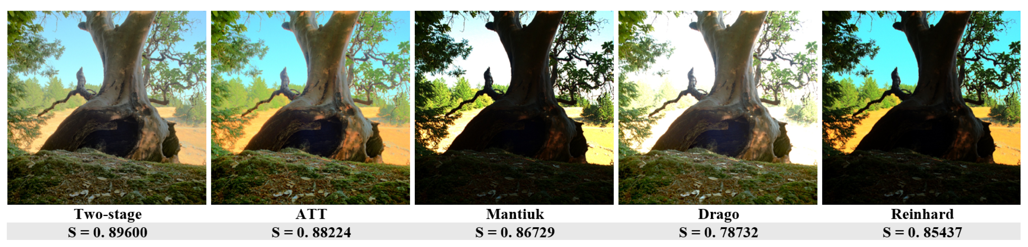 Figure 6 presents the structural fidelity assessment for a complex natural scene. The two-stage method produces the most coherent textures across both shadows and illuminated areas, corresponding to the highest S value. ATT performs similarly but loses minor detail near the bright trunk. Mantiuk and Reinhard generate darker mid-tones, while Drago exhibits severe highlight clipping.