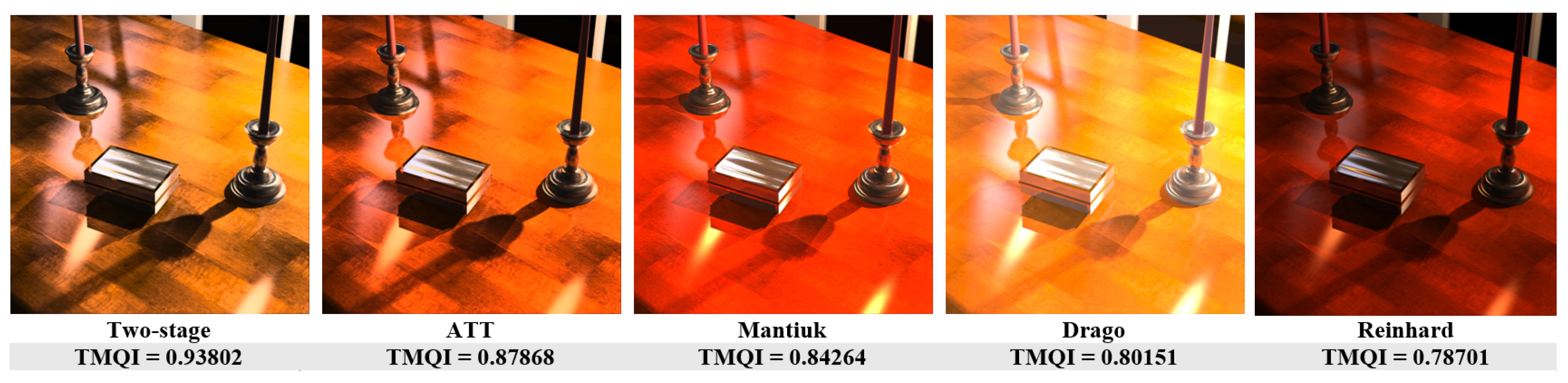 Figure 5 illustrates a high-contrast indoor lighting scene. The proposed two-stage approach achieves the highest TMQI value, preserving fine reflections on metallic surfaces while maintaining color fidelity and balanced illumination. The ATT result is visually comparable but slightly less consistent across bright highlights. Mantiuk introduces local over-enhancement, whereas Drago and Reinhard either overexpose or darken extensive regions, thereby reducing perceptual realism.