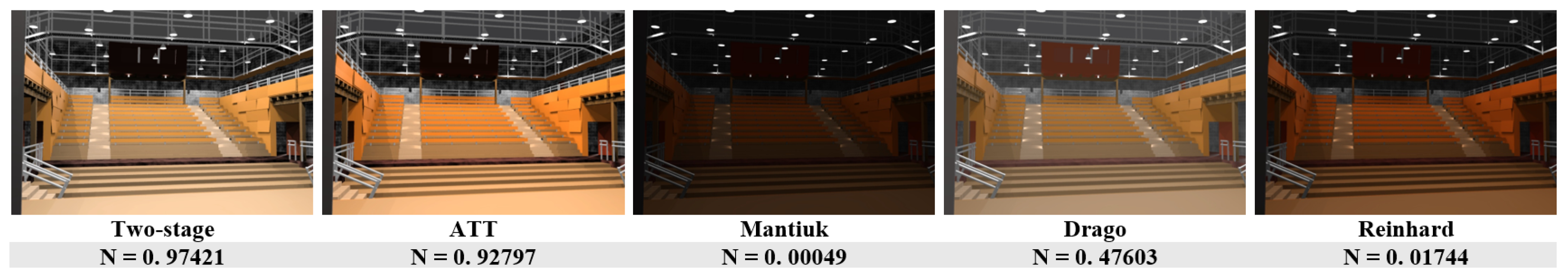 Figure 7 compares perceptual naturalness for an indoor scene. The proposed method produces a well-balanced rendering with realistic brightness and contrast, reflected in the highest naturalness score. ATT maintains perceptual balance with slight contrast compression, whereas Mantiuk and Reinhard yield underexposed results, and Drago produces excessive brightness that reduces depth perception.
