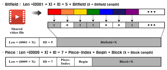 In BitTorrent, files are divided into multiple pieces, each typically 256 KB in size. The Bitfield message indicates the indexes of the file pieces a peer already possesses. The format of the Bitfield message is illustrated in Figure 3. The bitfield, consisting of X bytes, represents the possession status of specific pieces. The piece corresponding to the highest bit of the first byte is checked first. A bit value of “1” indicates that the corresponding piece is possessed, whereas a bit value of “0” means that the piece is not owned by the peer. Because the number of pieces depends on the total file size, the length of the bitfield is variable. The Bitfield message is transmitted only after the three-way handshake is completed. Since the BitTorrent protocol does not provide an authentication mechanism for Bitfield messages, their modification may not be detected abnormally [28].