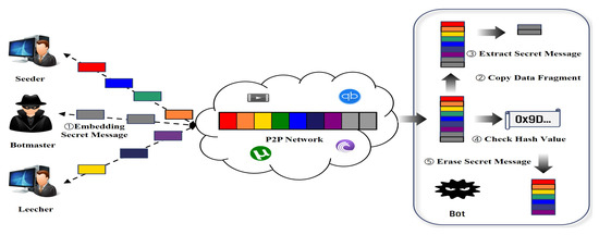 Steganography is a common technique used in cyberattacks, and it is difficult to detect its presence. Unlike cryptography, which relies on encryption and can be easily identified, steganography conceals messages within ordinary media files, making detection highly challenging [1]. A botnet is a network of devices infected with malware and remotely controlled by a single entity, known as a bot-herder or botmaster, through command and control (C&C) messages [2]. Malicious actors can utilize botnets to take control of legitimate web services or to steal sensitive personal and financial information. Well-known examples of cyberattacks involving botnets include ransomware, distributed denial-of-service (DDoS) attacks, spyware, and illegal information harvesting [3]. Botnet architectures have evolved from traditional centralized models that employ the HTTP protocol [4,5], to Peer-to-Peer (P2P) botnets that adopt decentralized communication structures [6]. In addition, hybrid botnets have been introduced, combining the advantages of both centralized and P2P models.
