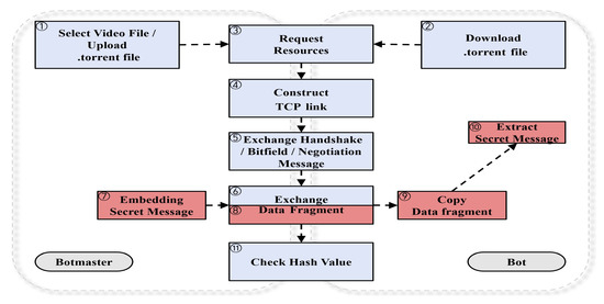 Network steganography techniques using P2P networks, including multimedia and VoIP services such as Skype and WeChat, have been extensively studied [21,22,23]. Wang [24] proposed a covert communication channel employing Bitfield messages in BitTorrent, demonstrating resistance to machine learning-based steganalysis. However, this approach failed to achieve a satisfactory payload compared to traditional digital steganography, securing only about 1 KB of hidden data per 255 KB of cover medium. Unlike SNS platforms, P2P networks impose no transmission capacity limit, allowing for the construction of digital Stego-botnets that can secure large payloads. Nevertheless, because an attacker shares only a single file, the communication availability is limited to one peer, increasing the risk of tracing the attack’s origin or having the file hash registered as malicious [25].