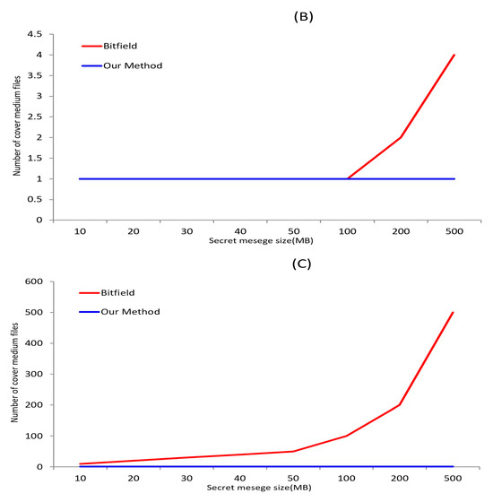Number of cover medium files measure for Bitfield and Piece message used in experiments—(A) Avg., (B) Max., and (C) Min.